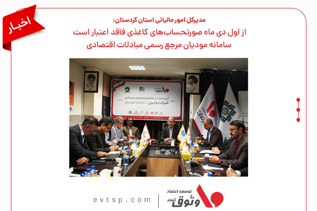 به گزارش روابط عمومی امور مالیاتی کردستان، آیین امضای تفاهمنامههای همکاری با حضور مدیرکل امور مالیاتی کردستان، مدیرعامل شرکت وثوق بهعنوان نهمین شرکت معتمد مالیاتی کشور، رئیس پارک علم و فناوری کردستان، رئیس اتاق اصناف استان و مدیرعامل شرکت تیروژکاران (اپلیکیشن تخصصی دودوتا) برگزار شد.