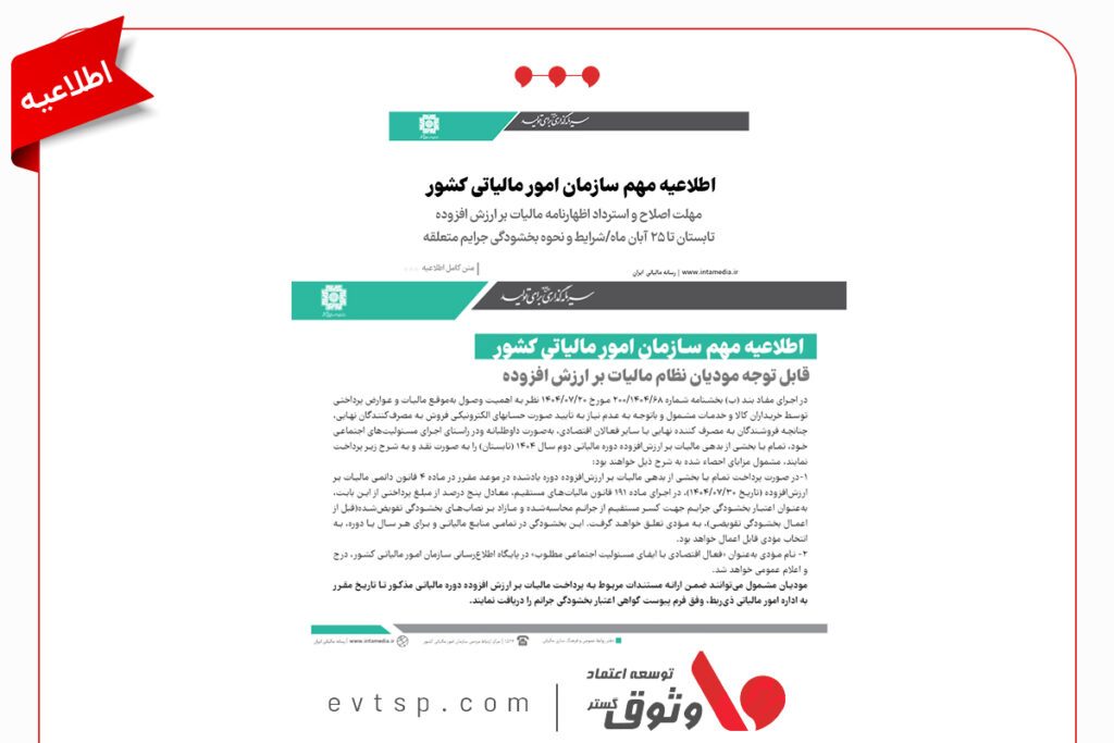 مودیان مشمول میتوانند ضمن ارائه مستندات مربوط به پرداخت مالیات بر ارزش افزوده دوره مالیاتی مذکور تا تاریخ مقرر به اداره امور مالیاتی ذی ربط، وفق فرم پیوست گواهی اعتبار بخشودگی جرائم را دریافت نمایند.