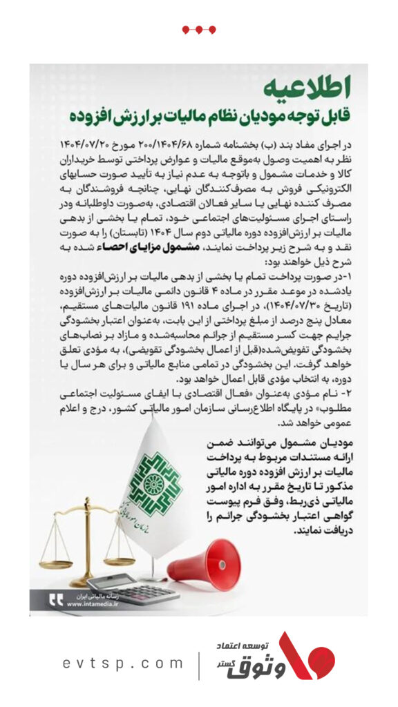 در اجرای مفاد بند (ب) بخشنامه شماره 68/1404/200 مورخ 20/07/1404 نظر به اهمیت وصول به موقع مالیات و عوارض پرداختی توسط خریداران کالا و خدمات مشمول و با توجه به عدم نیاز به تایید صورت حسابهای الکترونیکی فروش به مصرف کنندگان نهایی، چنانچه فروشندگان به مصرف کننده نهایی یا سایر فعالان اقتصادی، به صورت داوطلبانه و در راستای اجرای مسئولیتهای اجتماعی خود، تمام یا بخشی از بدهی مالیات بر ارزش افزوده دوره مالیاتی دوم سال 1404(تابستان) را به صورت نقد و به شرح ذیل پرداخت نمایند، مشمول مزایای احصاء شده به شرح ذیل خواهند بود: