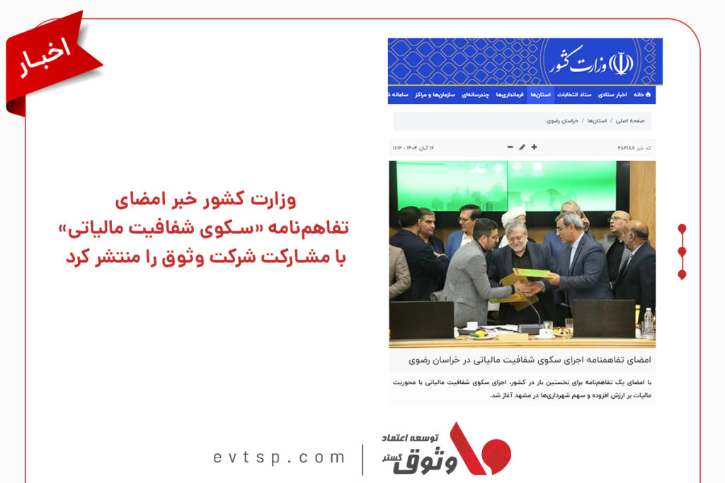 وزارت کشور خبر امضای تفاهمنامه «سکوی شفافیت مالیاتی» با مشارکت شرکت وثوق را منتشر کرد